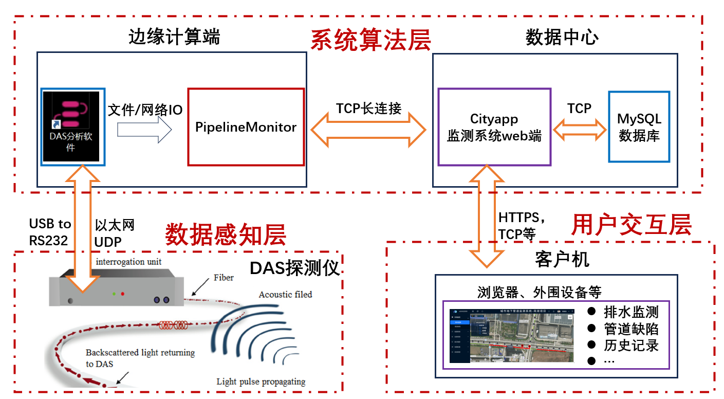 - 环境感知层:基于分布式光纤声波传感器(DAS)与单模暗光纤,实现管线振动、应变等物理量的实时采集。