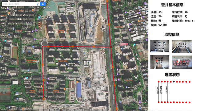 - 管井管理页面,地图中黄色方块为管井,红色线条为线缆。用户可以点击方块选中管井,也可以搜索方式查找。选中后可查看管井所有信息、通过摄像头查看当前情况、设置修改管理