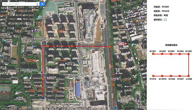 - 辅助铺缆,选择开始井和结束井以及一些相关的参数,系统可以根据现有管井可用管口的情况生成一条最优的线缆铺设路径。